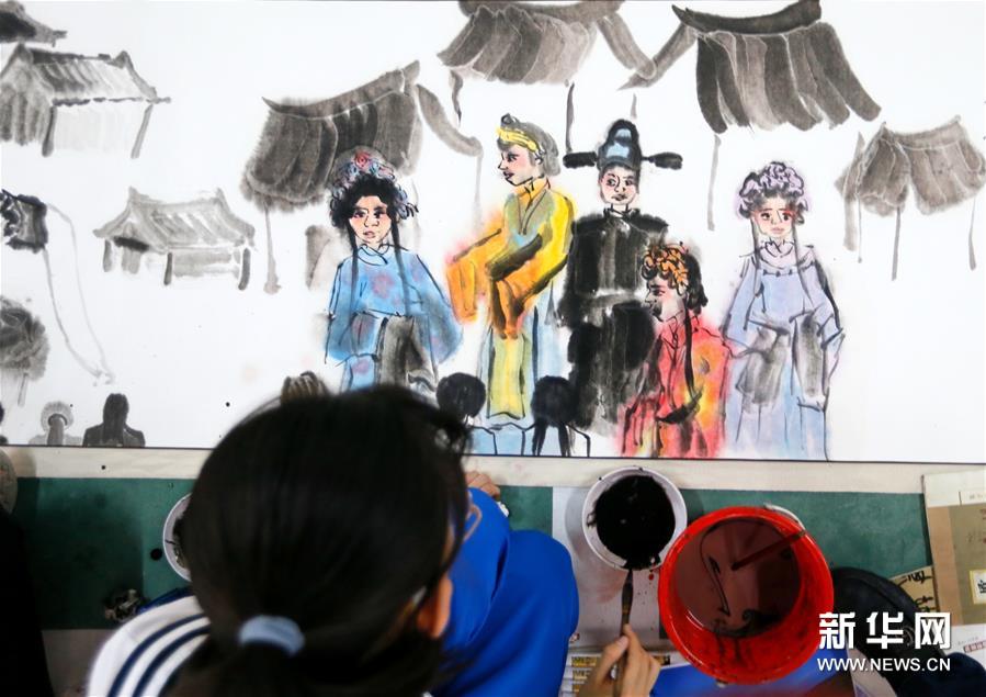 7月13日,小学生在水墨长卷绘画展示活动中作画。 当日,在山东省青岛市即墨区德馨小学西校区举行的全国中小学水墨长卷《我爱祖国》绘画展示活动上,120名学生用手中的画笔描绘祖国大好河山和巨大变化,向新中国成立70周年献礼。 新华社发(梁孝鹏 摄)