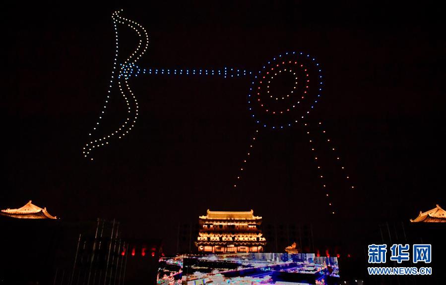 这是7月15日拍摄的活动启动仪式上的无人机表演。 当日,2019山西大同云冈文化旅游系列活动的启动仪式在大同古城内举行。 新华社记者 曹阳 摄