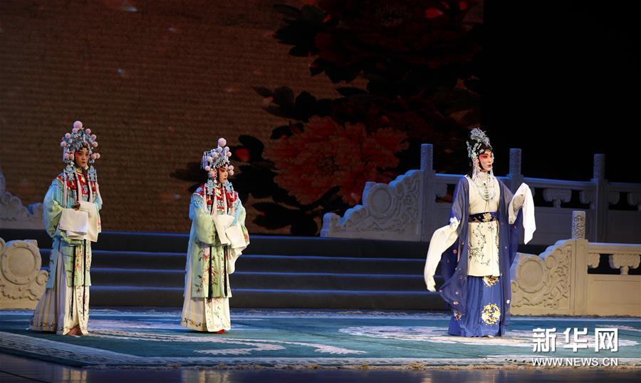 7月15日晚,大学生京剧爱好者在第十四届全国高校京剧演唱会开幕式上表演京剧《太真外传》。 当日,第十四届全国高校京剧演唱会在甘肃兰州金城大剧院拉开帷幕。来自北京大学、复旦大学等国内高校的京剧爱好者将在为期6天的时间里为观众献上300余个精彩剧目。 新华社发(张智敏 摄)