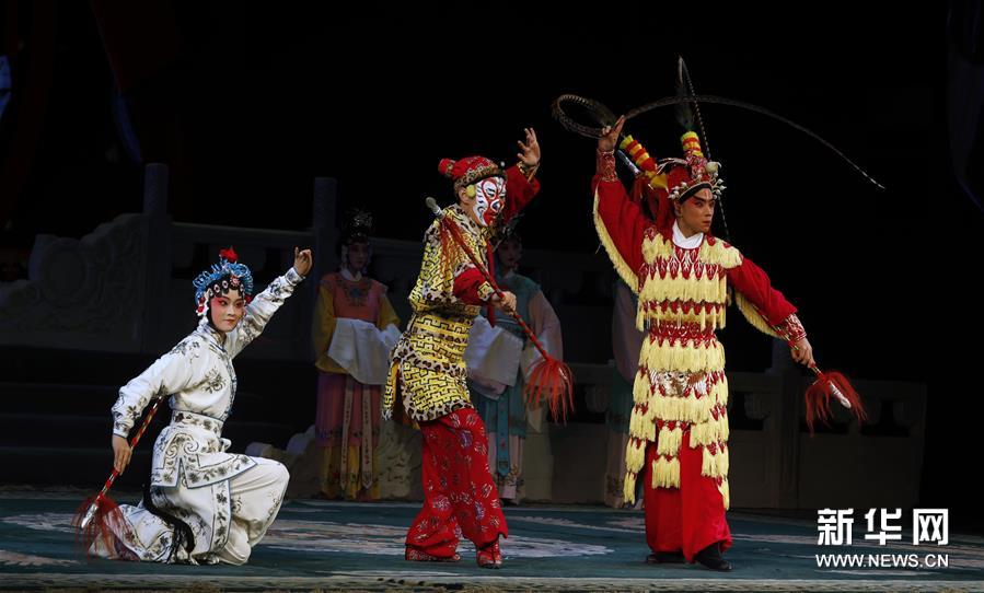 7月15日晚,演员在第十四届全国高校京剧演唱会开幕式上表演戏曲选段。 当日,第十四届全国高校京剧演唱会在甘肃兰州金城大剧院拉开帷幕。来自北京大学、复旦大学等国内高校的京剧爱好者将在为期6天的时间里为观众献上300余个精彩剧目。 新华社发(张智敏 摄)
