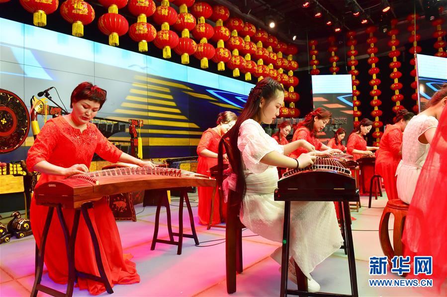 7月15日,在河津市广播电视台,王文卓(中)在传统与经典民乐音乐会上演奏古筝。 新华社发(刘亮亮摄)