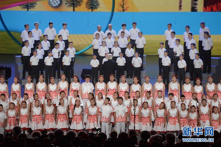 7月17日,在昆明云南大剧院,巴黎圣十字男童合唱团和昆明红叶少年合唱团在开幕式上共同表演童声大合唱《歌声与微笑》。 当日,第六届中国聂耳音乐(合唱)周在云南开幕。本届音乐周以“礼赞新中国·奋进新时代”为主题,将在昆明、玉溪两地推出一系列丰富多彩的活动。 新华社记者秦晴摄