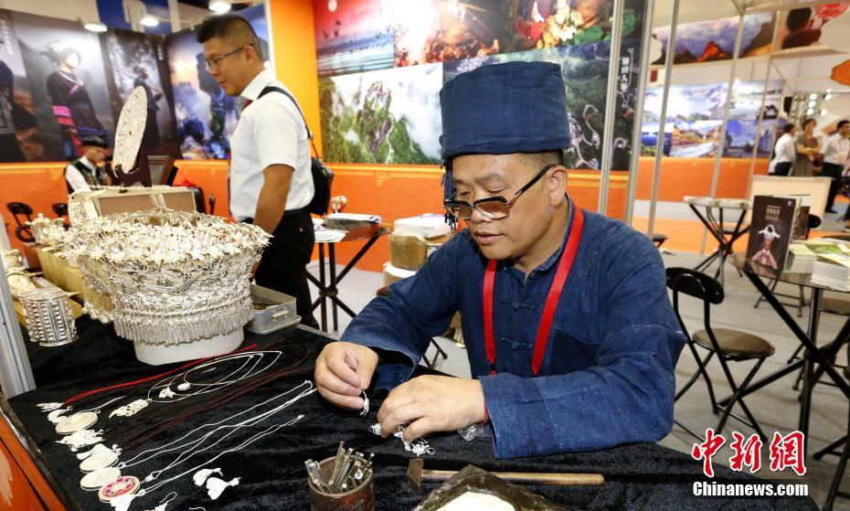 7月19日,2019海峡两岸台北夏季旅展在台北世贸中心登场。大陆21个省区市联袂来台,以“美丽中华”为主题共同参展。图为贵州非遗传承人现场展示传统银饰工艺,文旅融合趋势也让展会现场更加丰富多彩。中新社记者 刘舒凌 摄
