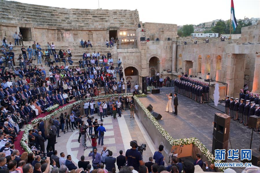 7月18日,在约旦杰拉什,人们在开幕式上观看演出。新华社记者 林晓蔚 摄