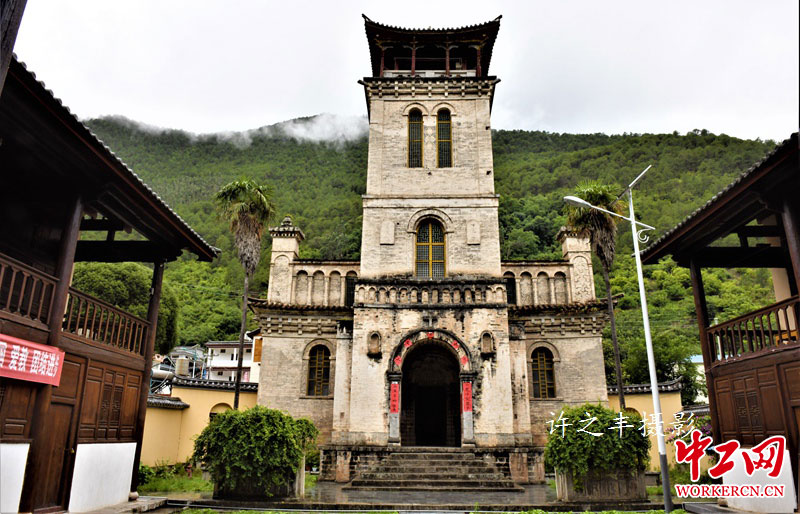 茨中教堂位于云南省德钦县燕门乡。始建于清同治六年(1867年),原在自菇村,法传教士主持兴建。光绪十八年(1892年)被焚毁,后于光绪二十六年(1900年)移至茨中重建。教堂包括大门、前院、圣堂、后院、果园、菜园、葡萄园、水田等,主体建筑坐西向东,为中西式结合的建筑。大门砖砌,似牌楼样式,三层,下作通道,上建攒尖顶亭阁,上置十字架。气派的教堂成为了“云南铎区”的主教礼堂。2006年05月被国务院批准列入全国重点文物。图为2019年7月11日燕门乡茨中教堂。工人日报-中工网许之丰摄影报道