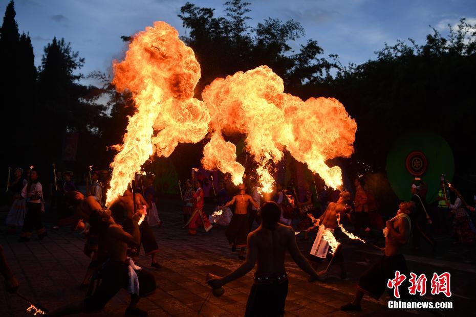 7月21日,几名少数民族男子口吐“火龙”。当日晚,云南民族村举行2019昆明火把节狂欢活动,来自各地的游客踩着欢快的音乐,在火的海洋中与少数民族民众一起共度“东方狂欢节”。火把节是彝族、白族、纳西族、拉祜族、哈尼族、普米族等民族的传统节日,在农历六月举行,节期二至三天。 中新社记者 刘冉阳 摄