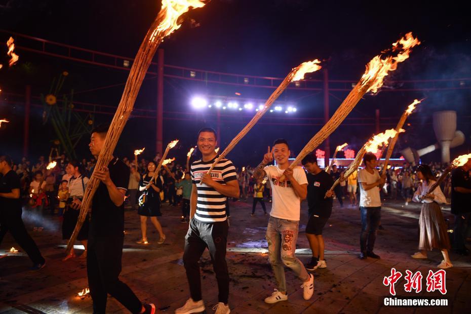 7月21日,火把节现场欢乐的游客。当日晚,云南民族村举行2019昆明火把节狂欢活动,来自各地的游客踩着欢快的音乐,在火的海洋中与少数民族民众一起共度“东方狂欢节”。火把节是彝族、白族、纳西族、拉祜族、哈尼族、普米族等民族的传统节日,在农历六月举行,节期二至三天。 中新社记者 刘冉阳 摄