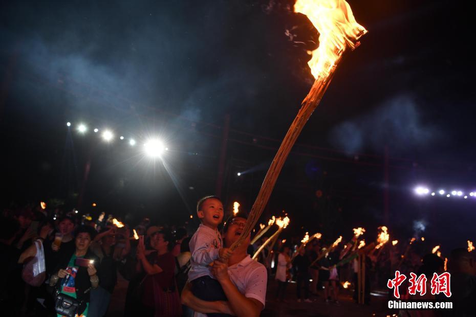7月21日,欢乐气氛感染现场观众。当日晚,云南民族村举行2019昆明火把节狂欢活动,来自各地的游客踩着欢快的音乐,在火的海洋中与少数民族民众一起共度“东方狂欢节”。火把节是彝族、白族、纳西族、拉祜族、哈尼族、普米族等民族的传统节日,在农历六月举行,节期二至三天。 中新社记者 刘冉阳 摄