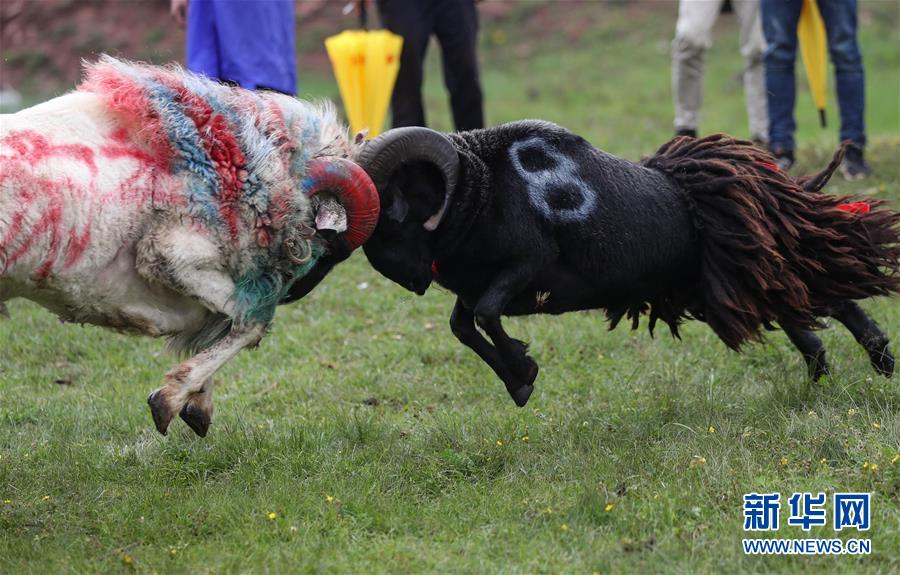 这是7月22日在布拖县衣某片区火把广场拍摄的传统民俗竞技比赛斗羊。新华社记者 江宏景摄