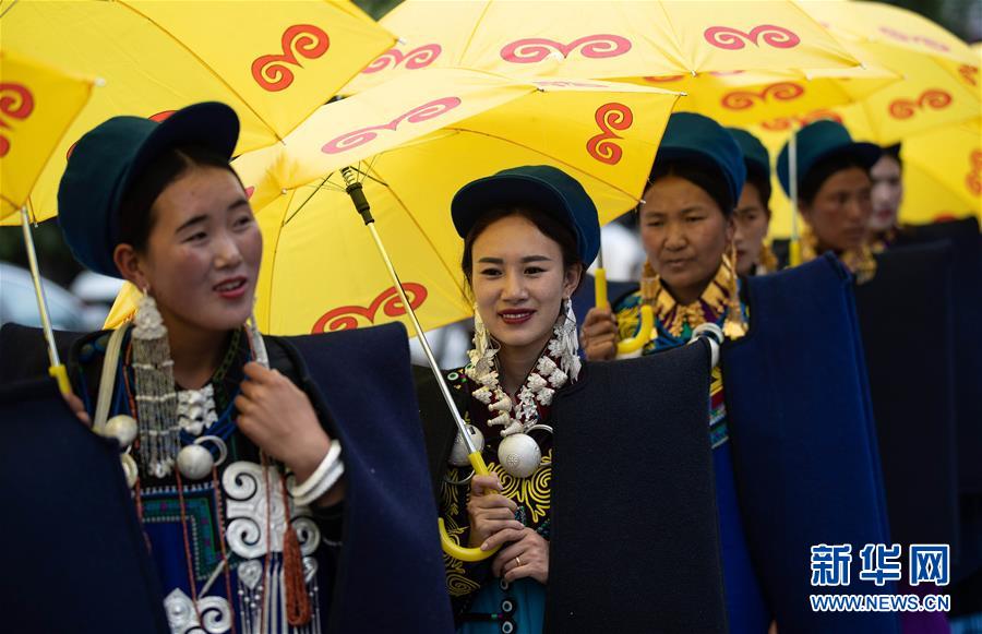 7月21日,在布拖县县城火把广场,当地彝族群众身着盛装参加巡游。新华社记者 江宏景摄