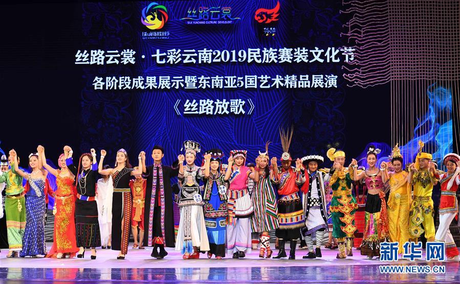 7月24日,模特在展示特色民族服饰。 7月24日,丝路云裳·七彩云南2019民族赛装文化节各阶段成果展示暨东南亚5国艺术精品展演《丝路放歌》在云南楚雄彝州大剧院举行,共有来自云南省16个州市的少数民族服饰及柬埔寨、老挝、缅甸、泰国、越南艺术精品参加展演。 新华社记者 杨宗友 摄