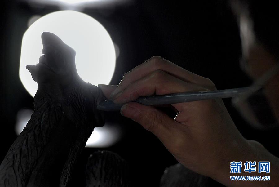 在河南省洛阳市孟津县南石山村的生产车间,高水旺在对唐三彩泥胎进行雕刻装饰(7月23日摄)。新华社记者李安摄