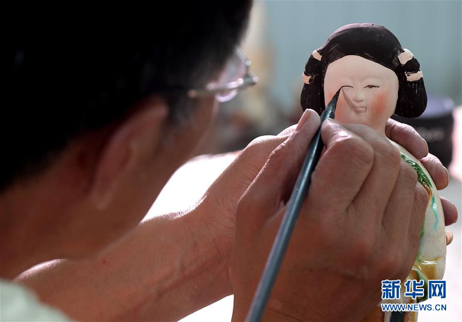 在河南省洛阳市孟津县南石山村的生产车间,高水旺在对二次烧制后的唐三彩人物进行开脸(7月23日摄)。新华社记者李安摄