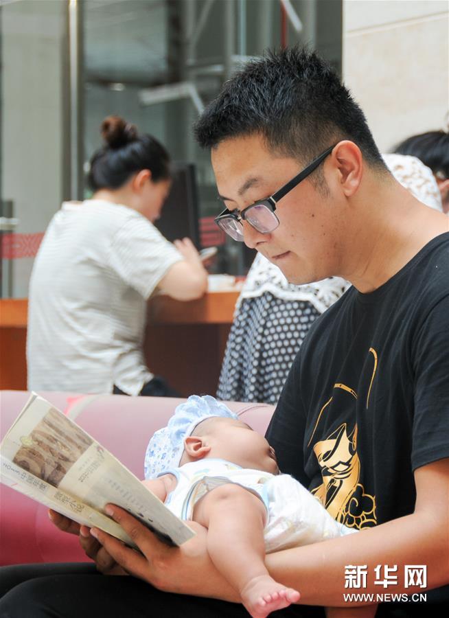 7月25日,一名怀抱婴儿的读者在内蒙古图书馆阅读。 进入暑期以来,内蒙古图书馆入馆人数大幅上升,来图书馆阅读书籍、查阅资料的读者络绎不绝。 新华社发(李志鹏 摄)