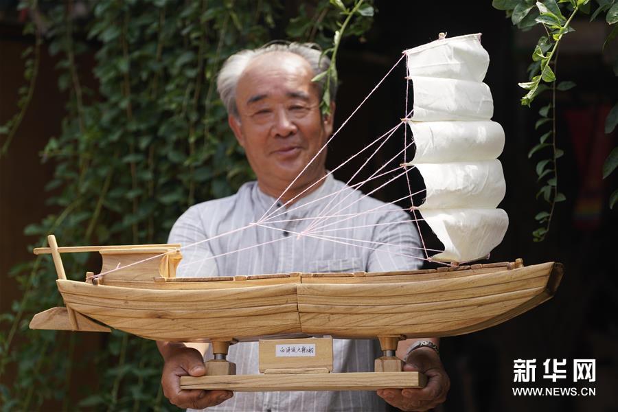 7月25日,刘广玉在展示他制作的白洋淀大槽子船。 今年68岁的刘广玉是河北雄安新区安新县马家寨村人,马家寨村是北方地区有名的造船专业村。刘广玉自幼喜欢摆弄木头,擅长木板画。他目前制作了21款白洋淀历史上出现过的木船模型,用手工打造白洋淀记忆。 新华社记者 邢广利 摄