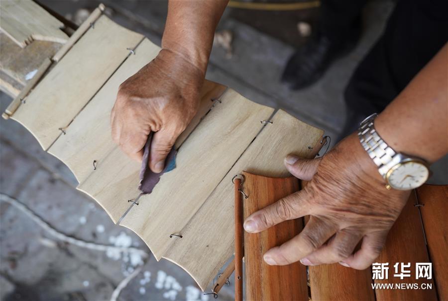 7月25日,刘广玉在打磨木船模型的帆。 今年68岁的刘广玉是河北雄安新区安新县马家寨村人,马家寨村是北方地区有名的造船专业村。刘广玉自幼喜欢摆弄木头,擅长木板画。他目前制作了21款白洋淀历史上出现过的木船模型,用手工打造白洋淀记忆。 新华社记者 邢广利 摄