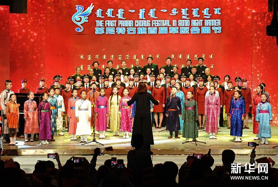 7月24日,在内蒙古苏尼特右旗影剧院举行的首届草原合唱节上,苏尼特之声合唱团、中国国际航空股份有限公司合唱团、苏尼特右旗少儿合唱团、中欧校友海棠花开合唱团四个合唱团成员演唱《歌唱祖国》。 当日,作为苏尼特右旗乌兰牧骑艺术节活动之一的苏尼特右旗首届草原合唱节在苏尼特右旗影剧院唱响。苏尼特之声合唱团、中国国际航空股份有限公司合唱团、苏尼特右旗少儿合唱团、中欧校友海棠花开合唱团四个合唱团参加表演。苏尼特右旗乌兰牧骑成立于1957年,多年来该团体先后创作出各类文艺作品2400多部,先后被授予“全国双服务先进乌兰牧骑”等光荣称号。 新华社记者 才扬 摄