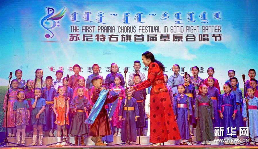 7月24日,在内蒙古苏尼特右旗影剧院举行的首届草原合唱节上,苏尼特右旗少儿合唱团指挥宝乐尔图雅(右)接受哈达。 当日,作为苏尼特右旗乌兰牧骑艺术节活动之一的苏尼特右旗首届草原合唱节在苏尼特右旗影剧院唱响。苏尼特之声合唱团、中国国际航空股份有限公司合唱团、苏尼特右旗少儿合唱团、中欧校友海棠花开合唱团四个合唱团参加表演。苏尼特右旗乌兰牧骑成立于1957年,多年来该团体先后创作出各类文艺作品2400多部,先后被授予“全国双服务先进乌兰牧骑”等光荣称号。 新华社记者 才扬 摄