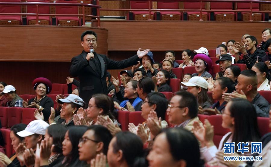 7月27日,中央歌剧院歌唱家赵一峦走进观众席演唱歌曲。 当日,中央歌剧院在云南省迪庆藏区自治州香格里拉市开展“我们的中国梦——文化进万家”活动,艺术家们以文艺小分队的形式在当地开展大师课、慰问演出、文化交流等。 新华社记者 金良快 摄