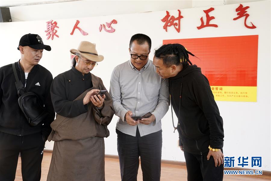 7月27日,中央歌剧院艺术家梁寒(右二)在与迪庆藏族自治州艺术家交流。 当日,中央歌剧院在云南省迪庆藏区自治州香格里拉市开展“我们的中国梦——文化进万家”活动,艺术家们以文艺小分队的形式在当地开展大师课、慰问演出、文化交流等。 新华社记者 金良快 摄