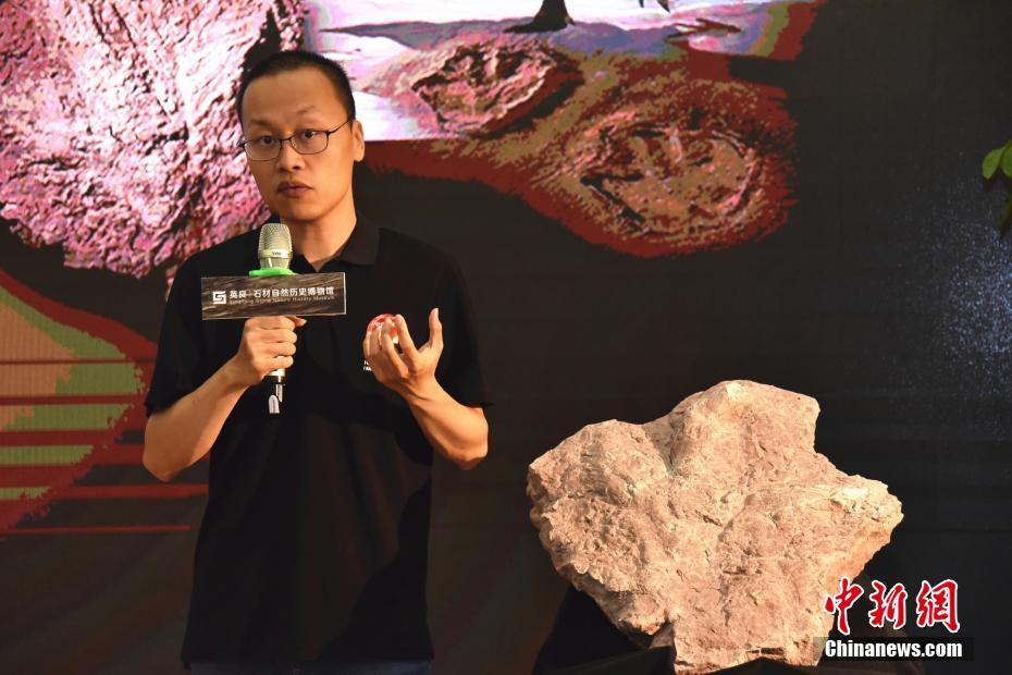 一枚恐龙足迹化石7月29日现身福建省泉州市南安水头镇,并被英良世界石材自然历史博物馆收藏。中国地质大学(北京)副教授邢立达新闻发布会上介绍称,该足迹化石系亚洲首例霸王龙足迹,长度达58厘米左右。陈龙山 摄
