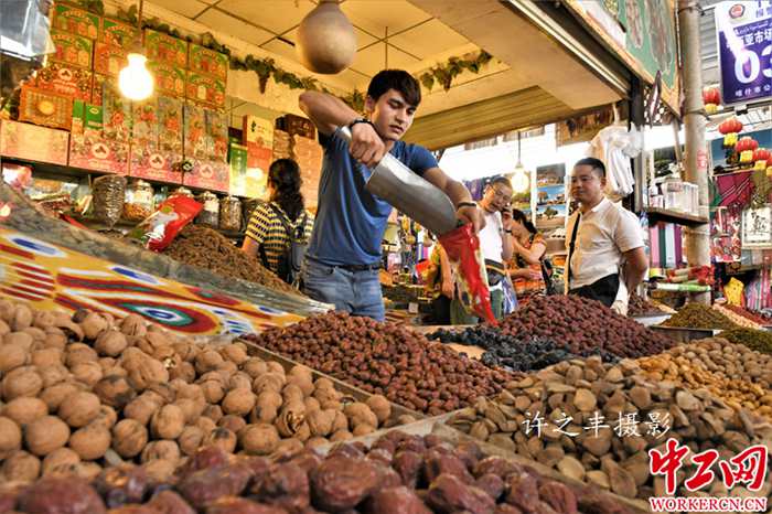 喀什大巴扎全称是中西亚国际贸易市场,位于喀什市东北角的吐曼河东岸。占地250亩,内设21个专业市场,设有5000多个摊位,是我国西北地区最大的国际贸易市场。这里的巴扎迄今已有两千多年的历史,古代有“亚洲最大集市”之称。巴扎系维吾尔语意为集市。图为2019年7月29日喀什国际大巴扎市场。工人日报-中工网许之丰摄影报道
