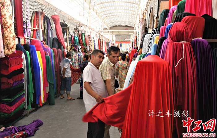 喀什大巴扎全称是中西亚国际贸易市场,位于喀什市东北角的吐曼河东岸。占地250亩,内设21个专业市场,设有5000多个摊位,是我国西北地区最大的国际贸易市场。这里的巴扎迄今已有两千多年的历史,古代有“亚洲最大集市”之称。巴扎系维吾尔语意为集市。图为2019年7月29日喀什国际大巴扎市场。工人日报-中工网许之丰摄影报道