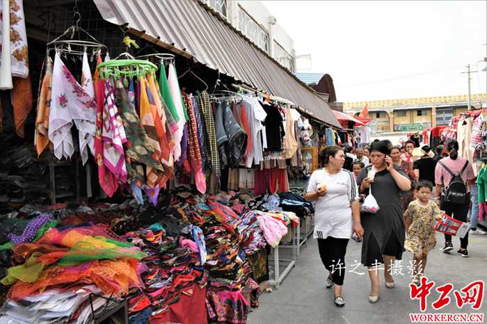 喀什大巴扎全称是中西亚国际贸易市场,位于喀什市东北角的吐曼河东岸。占地250亩,内设21个专业市场,设有5000多个摊位,是我国西北地区最大的国际贸易市场。这里的巴扎迄今已有两千多年的历史,古代有“亚洲最大集市”之称。巴扎系维吾尔语意为集市。图为2019年7月29日喀什国际大巴扎市场。工人日报-中工网许之丰摄影报道
