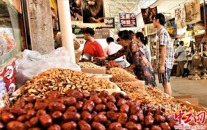 喀什大巴扎全称是中西亚国际贸易市场,位于喀什市东北角的吐曼河东岸。占地250亩,内设21个专业市场,设有5000多个摊位,是我国西北地区最大的国际贸易市场。这里的巴扎迄今已有两千多年的历史,古代有“亚洲最大集市”之称。巴扎系维吾尔语意为集市。图为2019年7月29日喀什国际大巴扎市场。工人日报-中工网许之丰摄影报道