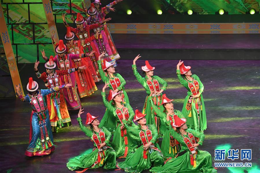 7月29日,在甘南大剧院,演员们表演歌舞《裕固欢歌》。新华社记者 范培珅 摄