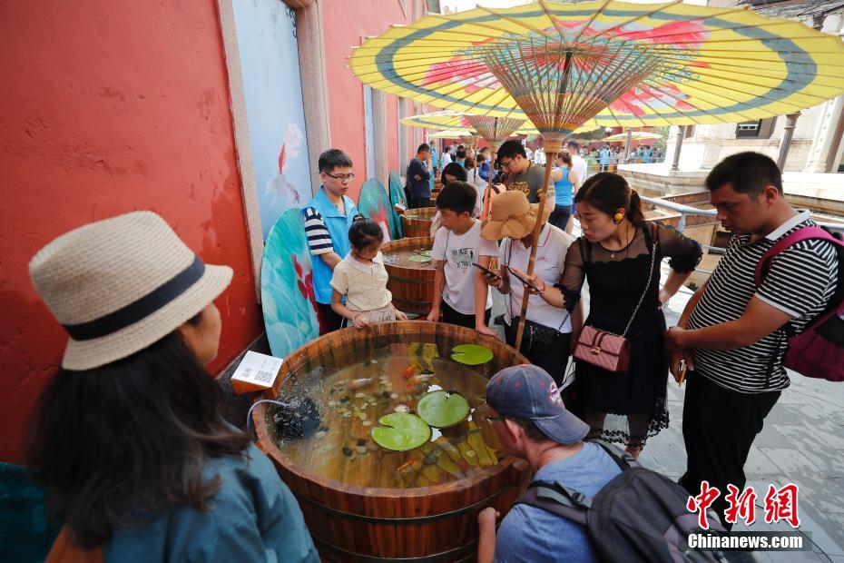 7月30日,“观鱼知乐——宫廷金鱼文化与故宫博物院藏金鱼题材文物联展”在北京故宫延禧宫开幕,吸引了众多游客参观。此次金鱼展共展出来自北京、上海、天津、武汉、南京、福州、苏州等12个地区42个品种的近200条宫廷金鱼,很多都是难得一见的珍品。其中鹅头红、王字虎头、奶牛花兰寿、十二红龙睛蝶舞、雪青望天球等品种十分罕见。展出使用传统木海,排放在延禧宫灵沼轩侧。故宫博物院藏金鱼题材文物展位于延禧宫东侧一层展厅,展出金鱼题材文物藏品34件(套)。中新社记者 杜洋 摄