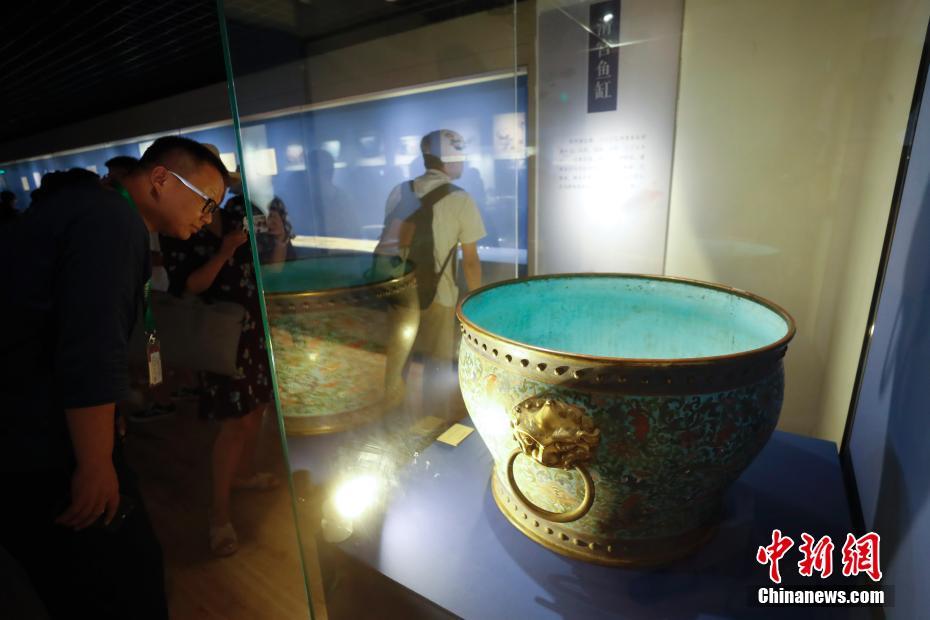 7月30日,“观鱼知乐——宫廷金鱼文化与故宫博物院藏金鱼题材文物联展”在北京故宫延禧宫开幕,吸引了众多游客参观。此次金鱼展共展出来自北京、上海、天津、武汉、南京、福州、苏州等12个地区42个品种的近200条宫廷金鱼,很多都是难得一见的珍品。其中鹅头红、王字虎头、奶牛花兰寿、十二红龙睛蝶舞、雪青望天球等品种十分罕见。展出使用传统木海,排放在延禧宫灵沼轩侧。故宫博物院藏金鱼题材文物展位于延禧宫东侧一层展厅,展出金鱼题材文物藏品34件(套)。图为展出的掐丝珐琅铺首耳鱼缸。中新社记者 杜洋 摄