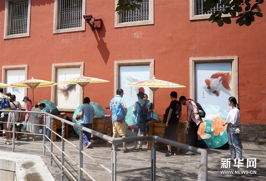 2019年7月30日,“观鱼知乐——宫廷金鱼文化与故宫博物院藏金鱼题材文物联展”在北京故宫延禧宫开幕。联展采用“实物+文物”的形式,分为金鱼展和金鱼题材文物展两个部分,展出来自北京、上海、福州、苏州等地的近200条宫廷金鱼和故宫博物院藏金鱼题材文物34件。 新华社记者 金良快 摄