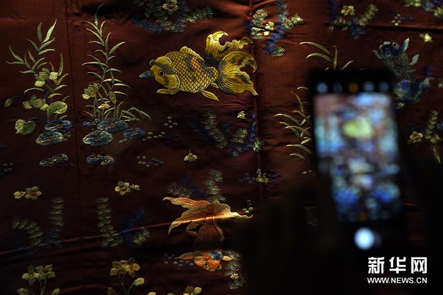 7月30日在故宫延禧宫拍摄的金鱼水藻纹衣料。 新华社记者 金良快 摄