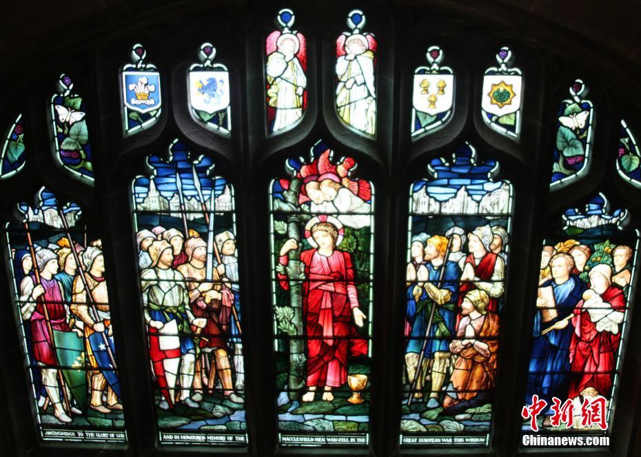 英国英格兰西北部的麦克斯菲尔德(Macclesfield)小镇,历史上丝绸制造业兴旺,曾被誉为英国的“丝绸之都”,为欧洲丝绸产业中心。该镇与中国的交往有400多年的历史,是古代“丝绸之路”在欧洲延伸的最西端。如今,随处可见的“丝绸元素”仍鲜活地呈现于世。图为小镇教堂窗户玻璃上与丝绸产业有关的桑蚕图案。中新社记者 张平 摄