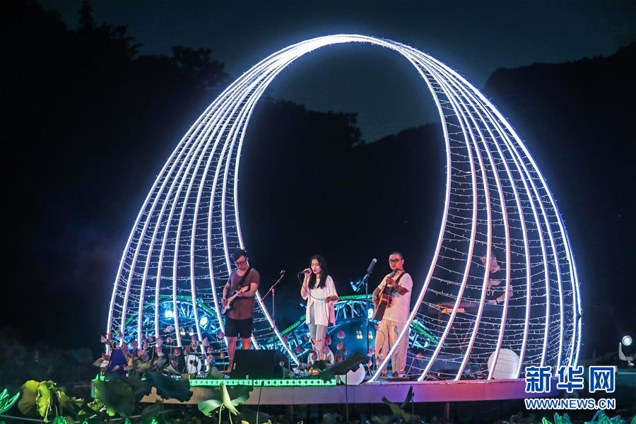 7月31日,乐队在里叶村十里荷花景区表演。 当日,浙江省建德市大慈岩镇里叶村十里荷花景区举办了一场夏日“荷塘乐色”音乐会。连绵的荷花与炫彩的舞台相互映衬,成为夏季夜晚一道独特的风景。据悉,里叶村每年夏季都会举办与荷花有关的乡村旅游节庆活动,包括赏荷、采荷、荷塘音乐会等。 新华社记者 徐昱 摄