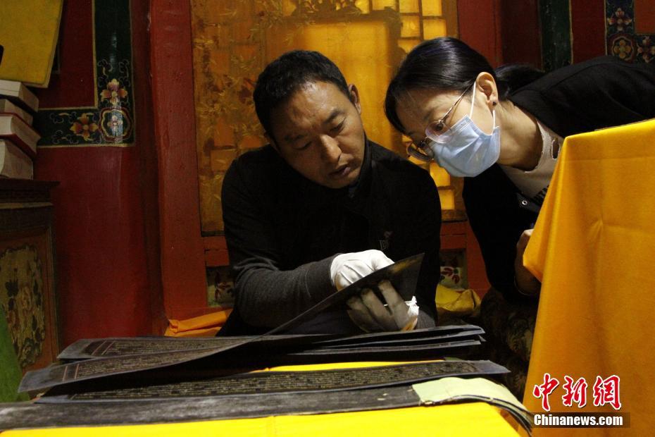 近日,西藏自治区古籍保护中心与罗布林卡管理处共同对罗布林卡的古籍进行普查登记。据了解,罗布林卡古籍普查登记工作已持续数月,截至8月1日,普查数量达到842函。当下,工作人员正在普查登记19世纪的手写本《甘珠尔经》。整个普查,工作人员将古籍的重量、尺寸、题记、页码、破损、虫蛀等等信息进行了详细登记。图为罗布林卡管理处两位工作人员登记古籍。赵朗 摄