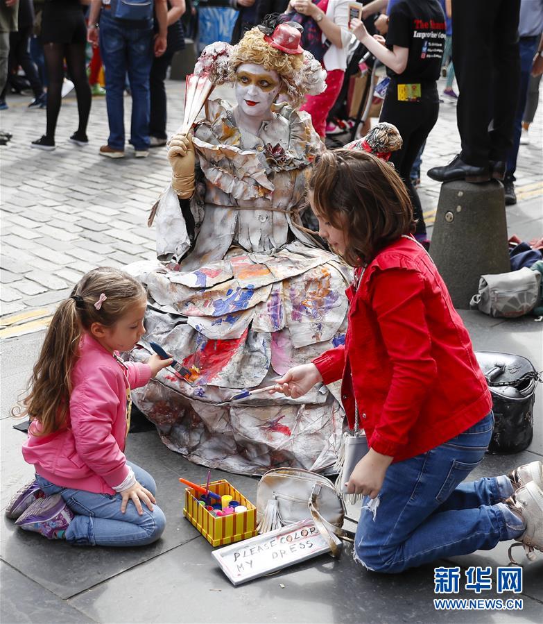 8月4日,在英国苏格兰爱丁堡,小朋友为一名街头艺术家的裙子涂上颜色。 每年8月,怀揣艺术梦想的“草根”艺术表演者来到爱丁堡边缘艺术节(又称艺穗节),展示他们的才华,开始逐梦之旅。边缘艺术节不设门槛,随处可演,以开放姿态迎接所有有才艺、有想法的表演者。 新华社记者 韩岩 摄