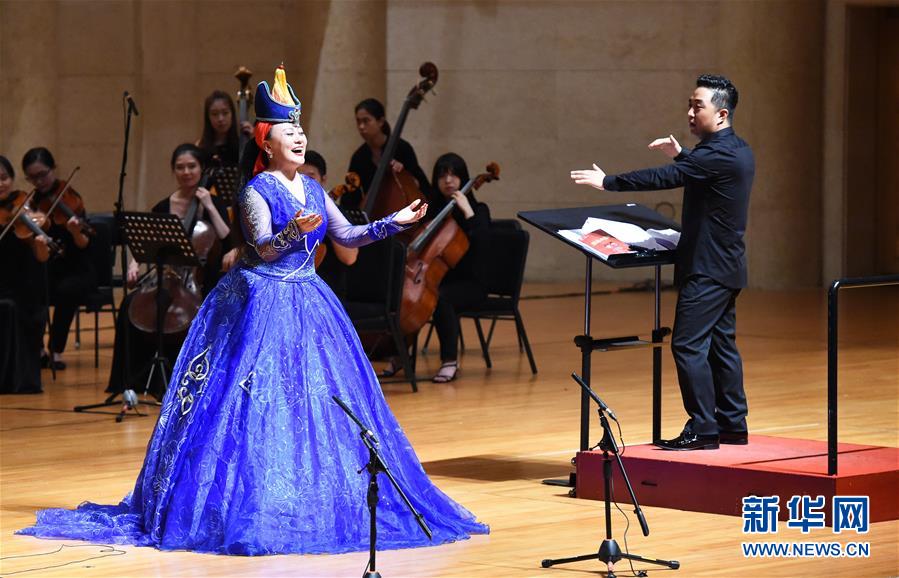 8月6日,中央民族歌舞团蒙古族歌手萨仁呼在音乐会上演唱歌曲《赞歌》。 当日,“国魂唤国粹·56个民族56场音乐会”首场演出在北京市中山音乐堂举行。据介绍,“国魂唤国粹·56个民族56场音乐会”每场音乐会挑选3至5个民族(或民族专场)、选取每个民族中最为经典的4至5种音乐元素及素材加以改编和再度创作,预计在未来的三至四年中完成约300余首“童声合唱作品”并演出,让观众在欣赏作品的同时,感受中国传统文化的魅力。 新华社发(任超 摄)