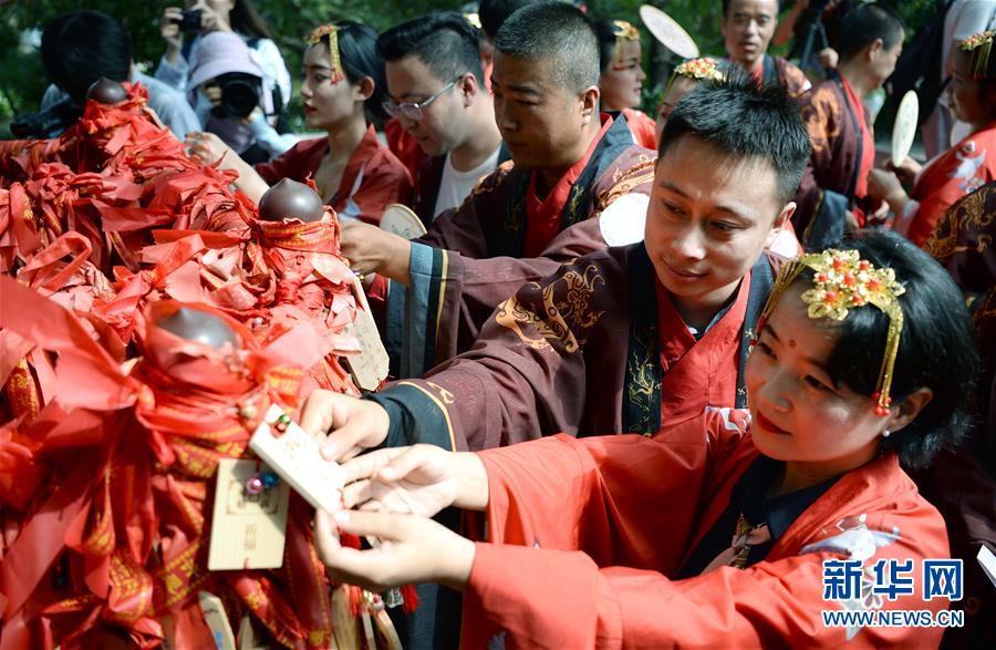8月7日,在西安华清宫“中华七夕情人节”活动现场,夫妻共系许愿牌。新华社记者 刘潇 摄