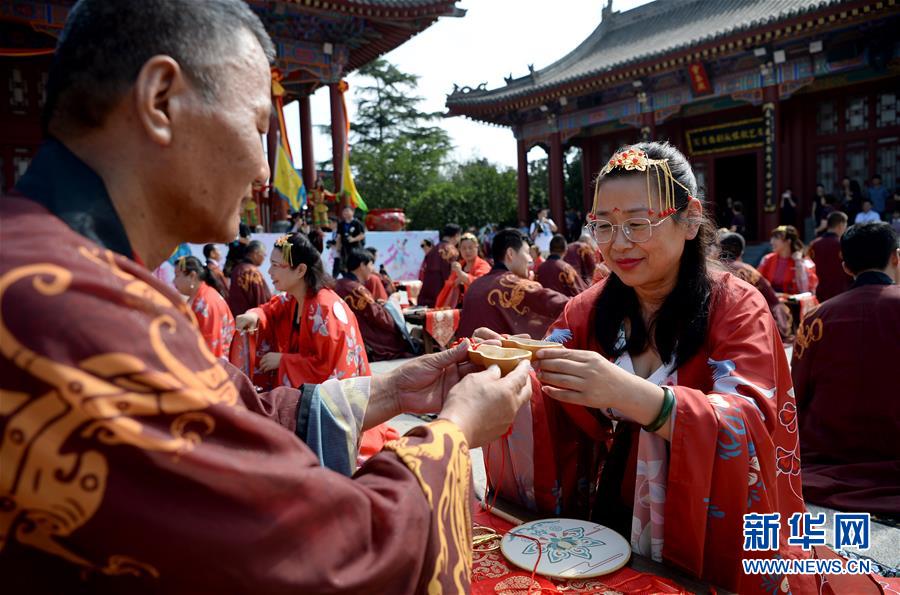8月7日,在西安华清宫“中华七夕情人节”活动现场,一对夫妻共饮交杯酒。新华社记者 刘潇 摄
