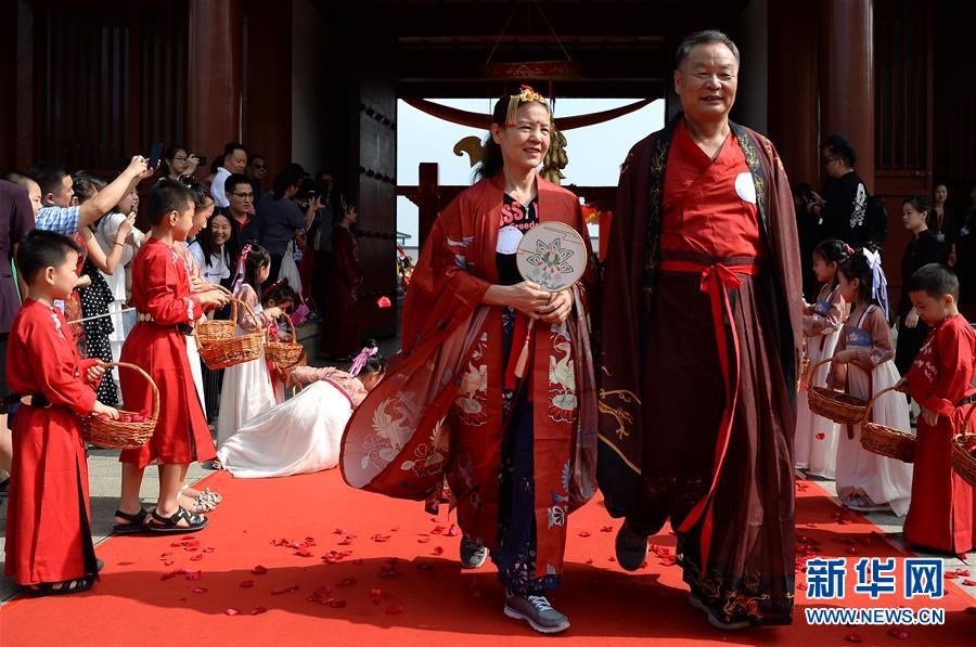 8月7日,在西安华清宫“中华七夕情人节”活动现场,一对夫妻步入华清宫。新华社记者 刘潇 摄