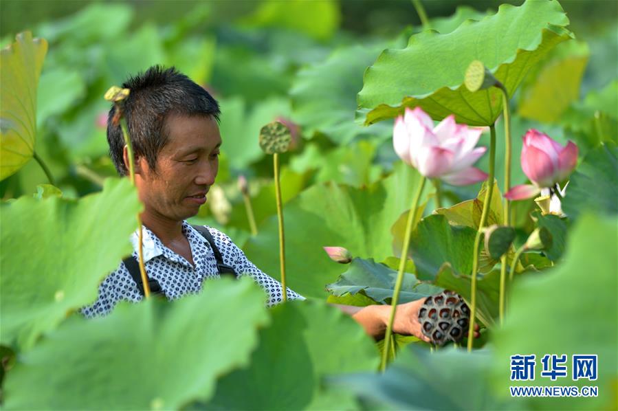 8月8日,村民在禾下土白莲藕立体种养基地采摘莲蓬。 当日是二十四节气中的立秋,在河北省磁县的禾下土白莲藕立体种养基地,当地农民采摘莲蓬,一派繁忙景象。 新华社记者 王晓 摄