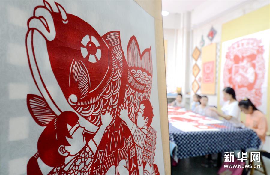 8月8日,剪纸艺人殷玲玲(右二)向学生们教授剪纸技艺。 暑假期间,河北省磁县剪纸艺人殷玲玲开办“暑假免费学剪纸”兴趣班,向孩子们教授剪纸技艺,让孩子们学习创作各式剪纸作品,感受传统文化,乐享假期生活。 新华社记者 王晓 摄