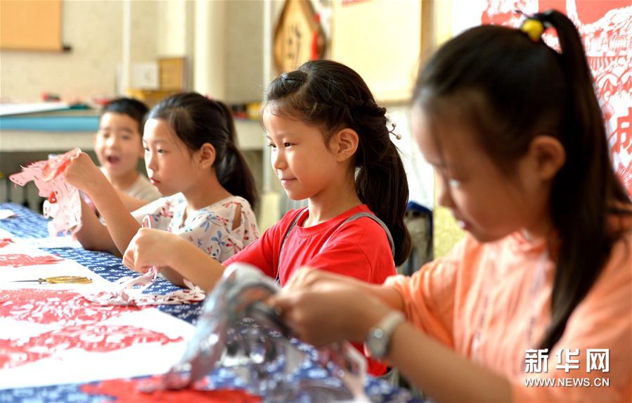 8月8日,孩子们在制作剪纸作品。 暑假期间,河北省磁县剪纸艺人殷玲玲开办“暑假免费学剪纸”兴趣班,向孩子们教授剪纸技艺,让孩子们学习创作各式剪纸作品,感受传统文化,乐享假期生活。 新华社记者 王晓 摄