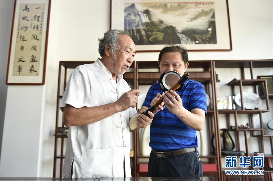 8月8日,在文港镇一家艺术馆内,工艺美术师周信兴(左)向来访者介绍自己在毛笔笔杆上创作的微雕作品。