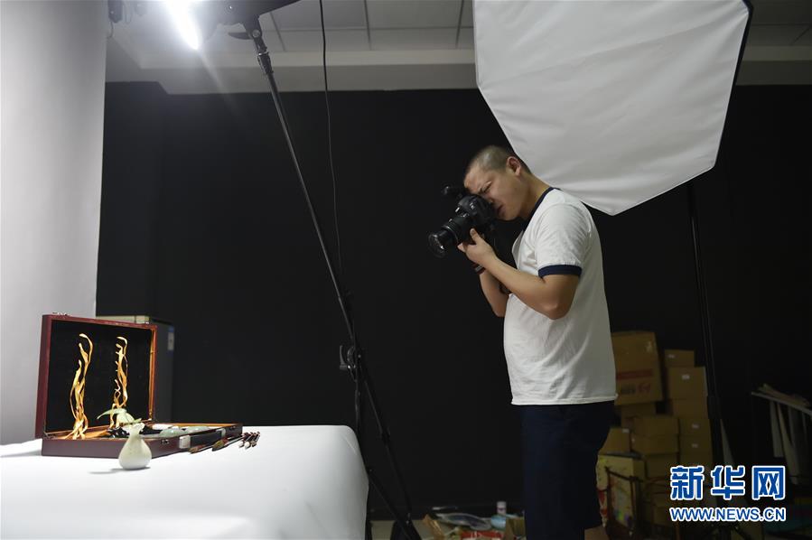 8月8日,在位于文港镇的中国文房四宝电子商务示范基地,一家毛笔电商的工作人员在拍摄毛笔制品的宣传照片。新华社记者 张汝锋 摄