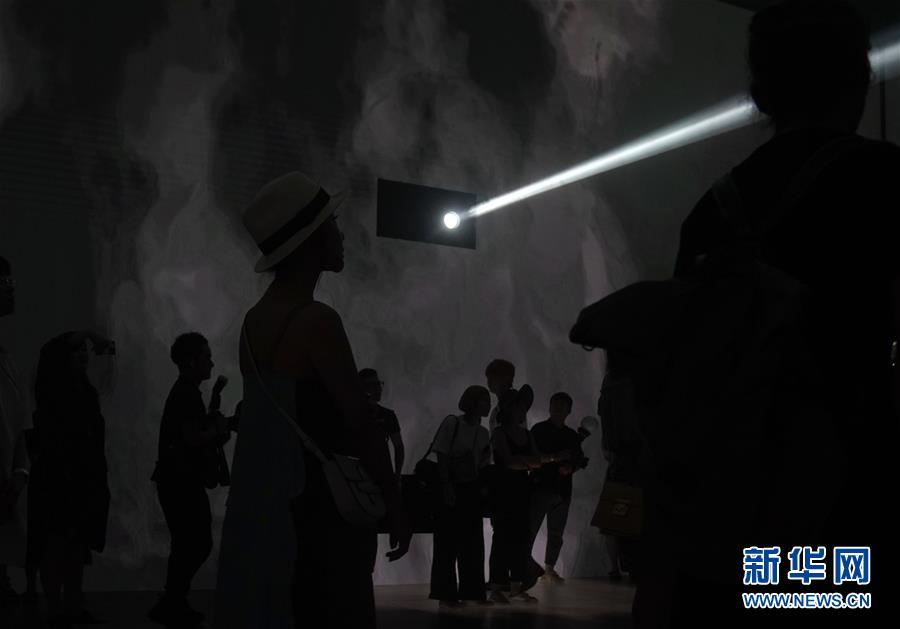 8月9日,观众在北京兰境艺术中心体验《九宫矩阵》沉浸式音乐光影艺术展。 当日,《九宫矩阵》沉浸式音乐光影艺术展在北京兰境艺术中心开幕。该艺术展运用多种技术,打造一个立体的巨型音乐盒,为现场观众带来沉浸式的艺术体验。 新华社记者 金良快 摄