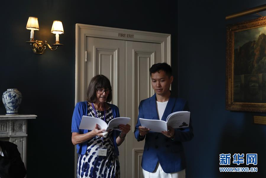 8月9日,在英国剑桥大学国王学院,一名诗人(左)与来自中国的播音员共同朗诵诗歌。 第五届剑桥徐志摩诗歌艺术节9日在剑桥大学国王学院拉开帷幕。百余位来自各国的诗人、艺术家和学者相聚于中国诗人徐志摩《再别康桥》笔下的康河畔,举办诵诗交流活动和艺术展。 新华社记者韩岩摄