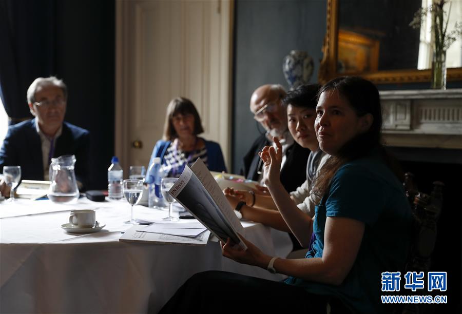 8月9日,在英国剑桥大学国王学院,一名诗人(右一)参与诗歌论坛活动。 第五届剑桥徐志摩诗歌艺术节9日在剑桥大学国王学院拉开帷幕。百余位来自各国的诗人、艺术家和学者相聚于中国诗人徐志摩《再别康桥》笔下的康河畔,举办诵诗交流活动和艺术展。 新华社记者韩岩摄